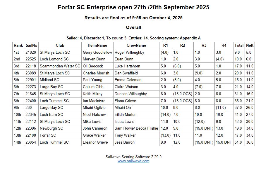 Congratulations to Gerry & Roger on winning the event, the Forfar Enterprise Cup, Morven & Euan took second place and Oli & Luke took third (in a 3 way tie on points being split by their 1st place win). Congratulations to Mhairi for winning the Scottish female enterprise helm (over 18) for a second year running and to Morven Dunn for winning the Scottish Junior Enterprise Helm.